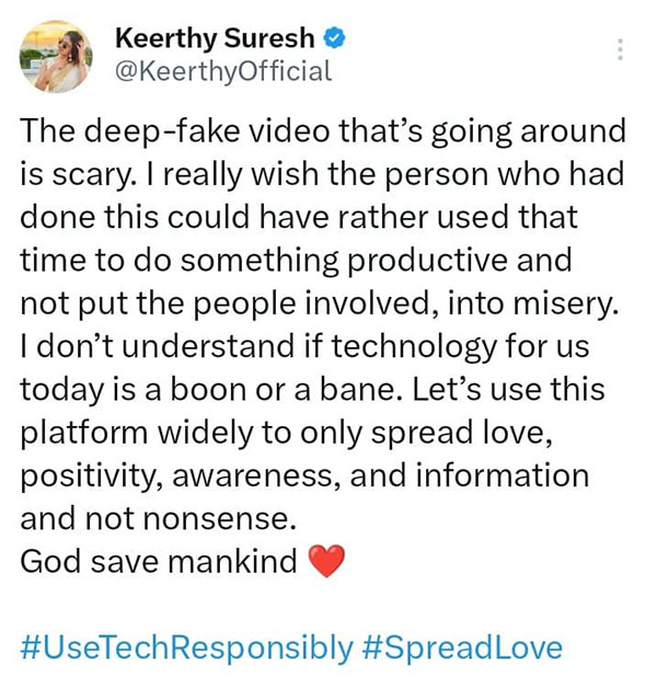 எனக்கு பயமாக உள்ளது. அதை உருவாக்கிய நபர் அந்த நேரத்தில் வேறு யாருக்காவது நல்லது செய்திருக்கலாம். இந்த தொழில்நுட்பத்தால் நமக்கு வரமா சாபமா என்று புரியவில்லை. அன்பு பாசிட்டிவ் மட்டுமே பரப்புவோம் மனிதர்களை கடவுள் தான் காப்பாற்ற வேண்டும் என்று தெரிவித்திருக்கிறார். மேலும், இந்த விஷயத்தால், கீர்த்தி சுரேஷ் உட்பட பல நடிகைகள் பயந்து வருவது குறிப்பிடத்தக்கது.