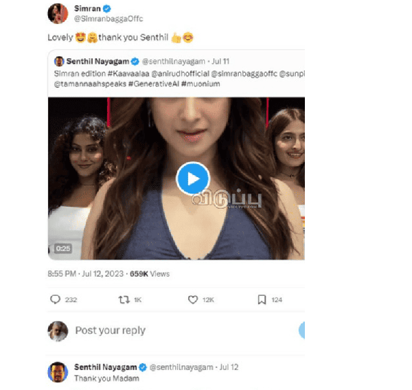 அந்த வகையில், நடிகை ராஸ்மிகா மந்தனாவின் முகத்தோடு வெளிநாட்டு மாடலின் வீடியோவை எடிட் செய்து வைரலாகியுள்ளனர். இதற்கு கடும் கண்டனங்களும் பிரபலங்கள் மற்றும் ரசிகர்கள் கொடுத்து வந்தன. இதேபோல், முன்பு ஜெய்லர் படத்தில் காவலா பாடலுக்கு ஆட்டம் போட்ட தமன்னாவிடம் துவங்கியது. தமன்னாவின் முகத்தை எடிட் செய்து சிம்ரன் முகத்தை வீடியோவாக வெளியிட்டு வைரலாகினர். அதில், நடிகை சிம்ரன் ஆதரவு செய்து நன்றி தெரிவித்தார்.