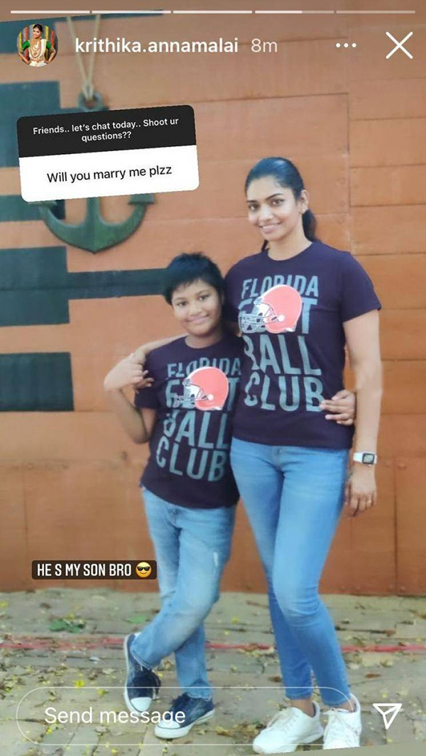 ஒரு கட்டத்தில் சண்டை அதிகம் ஆக, இருவரும் சேர்ந்து பரஸ்பர முடிவை எடுத்து பிரிந்துவிட்டோம் என்று கிருத்திகா பகிர்ந்திருந்தார். இந்நிலையில் சமீபத்தில் ஒரு ரசிகர், என்னை திருமணம் செய்து கொள்கிறீர்களா என்று கேள்வி எழுப்பி இருக்கிறார். அதற்கு கிருத்திகா தன் மகனுடன் எடுத்த புகைப்படத்தை பகிர்ந்து, இது என் மகன் ப்ரோ.. என்று கூறி பதிலளித்துள்ளார்.
