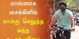 முதன்முறையாக வீட்டில் இருந்து சைக்கிளில் வாக்களிக்க வந்த விஜய்- வைரலாகும் வீடியோ !!